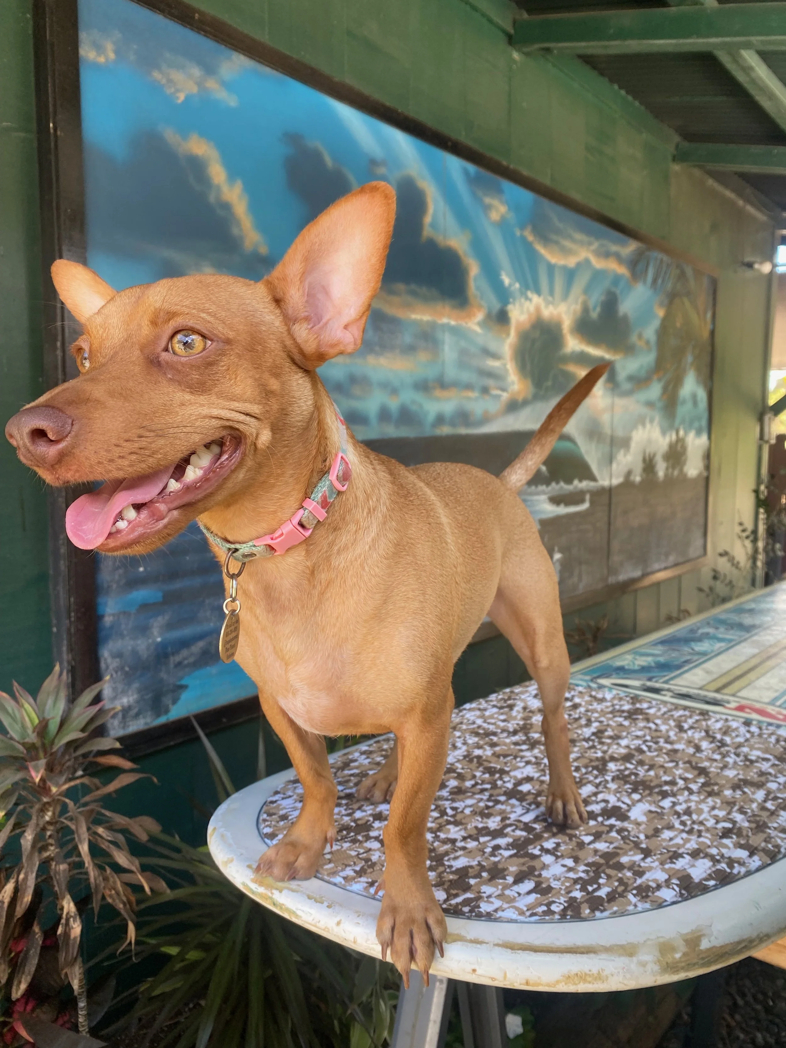 Dobby was rescued from Hawaii Dog Foundation on Nov 2020. His mom was a chiahuahua mix, but his DNA test said that he is mostly rat terrier. We named him Dobby, from Harry Potter, because of his ears. However, as he got older, they stood up! Dobby is one of our SUP instructors and he is the coolest.