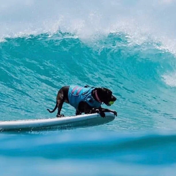 Phoenix is a.k.a “PhiPhi” or “Phi.” She grew up on the road exploring the sights, sounds and people of the USA. Some of her favorite activities include tennis balls, swimming, and SUPing. Through her love for fetch, she developed a love for the ocean. Phoenix is awesome at retrieving a ball from the water. She was barely 2 months old when she first stood on a surfboard, and by the age of 2 years, she was a pro surfer.